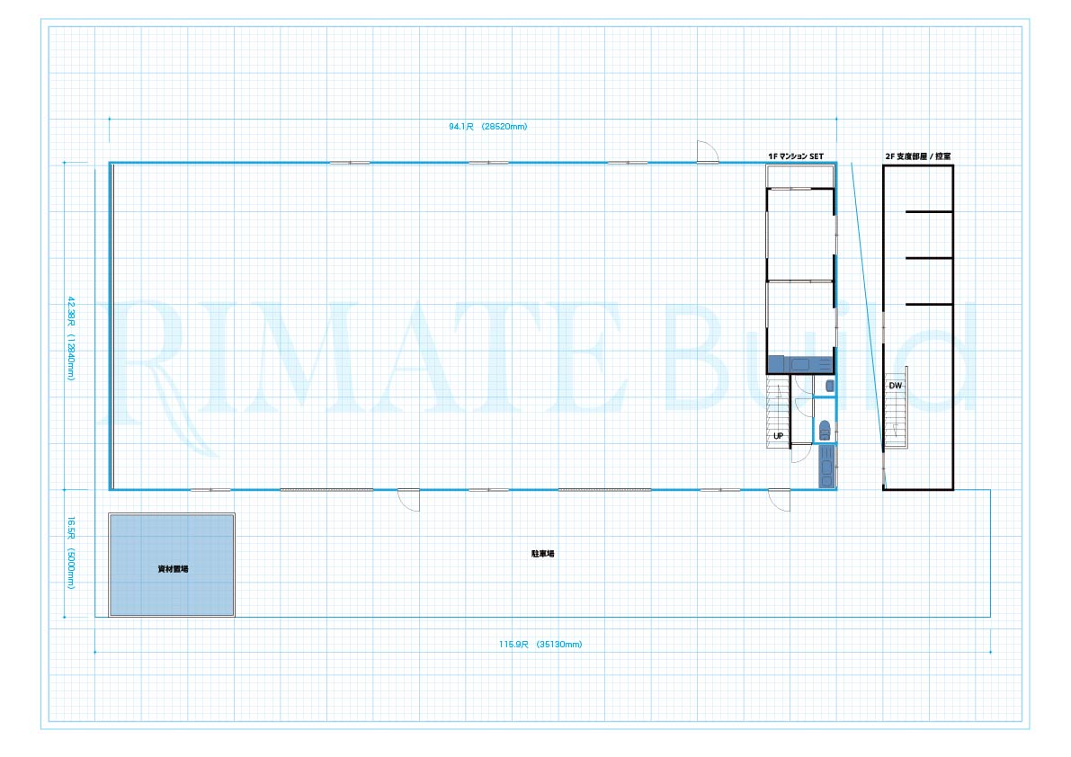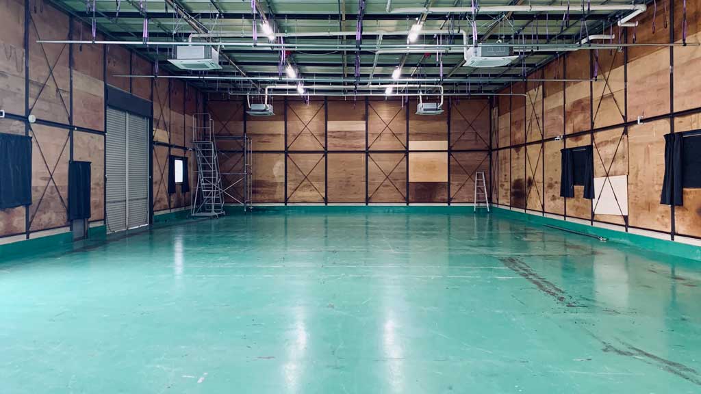 110坪のコンクリート床のステージで、レイアウト自由な建込スペース。