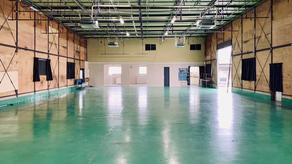 110坪のコンクリート床のステージで、レイアウト自由な建込スペース。